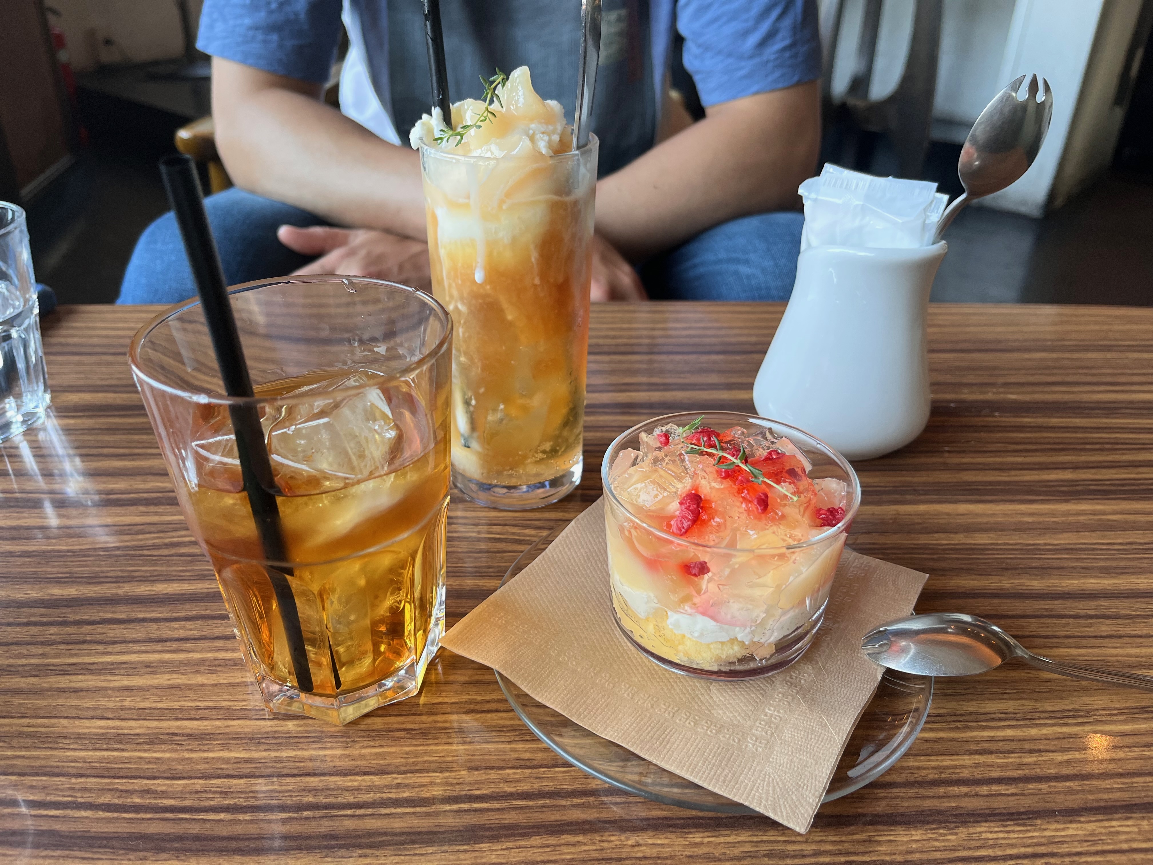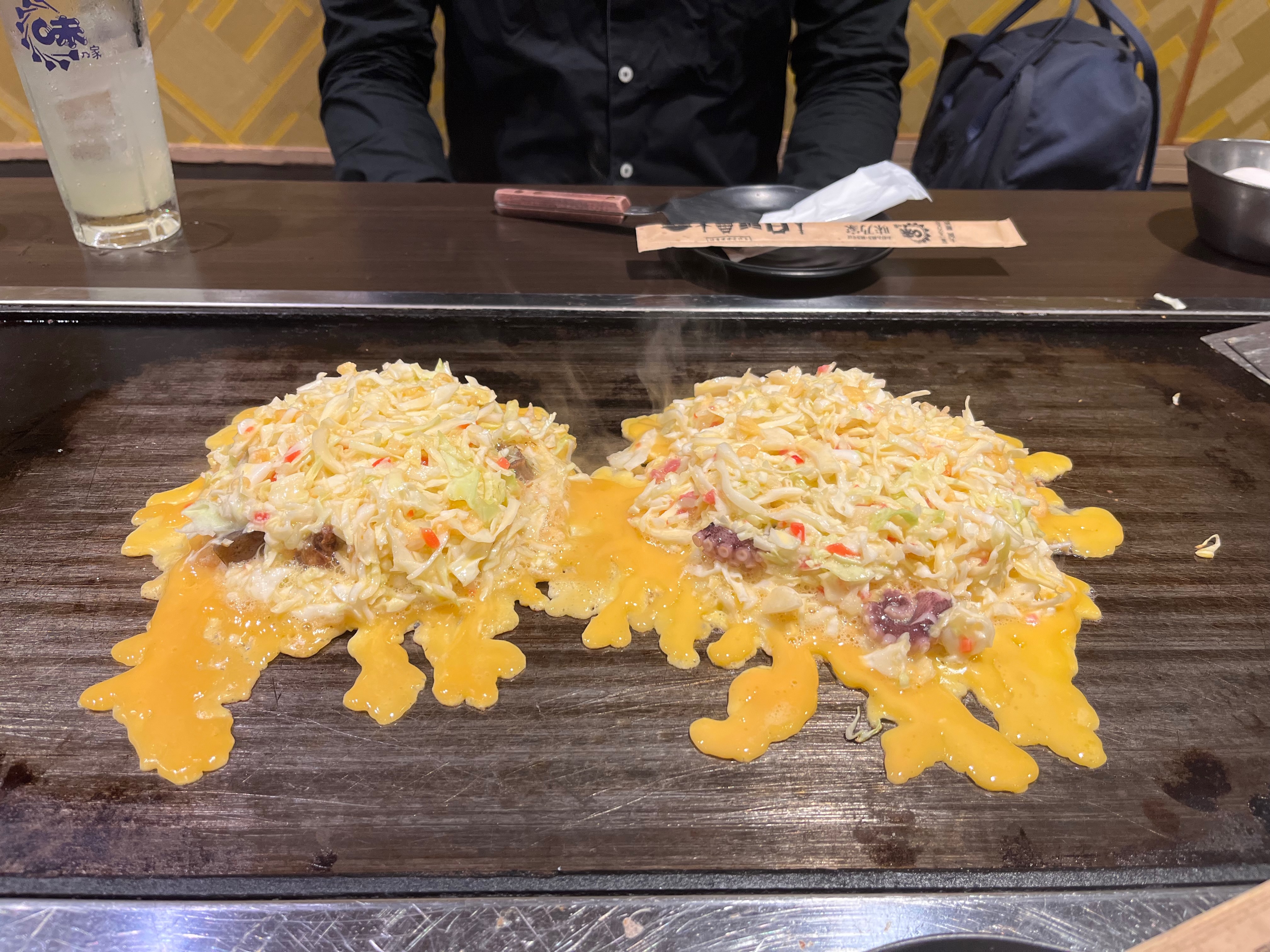 Since we arrived in the evening, we wanted to try some local specialties like the famous okonomiyaki, which is prepared with yakisoba. We found Hassei in our travel guide and wanted to try it. Our first attempt was unsuccessful because the restaurant was very small and crowded. They asked us to come back an hour later. In the meantime, we became thirsty and slightly hungry and headed to a nearby café. We found Café Citron, where we had refreshing drinks and a wonderful peach dessert. It was smooth, slightly sour, and full of aromatic flavor that felt like a summer evening in a glowing sunset. Just wonderful! The place was cozy, not crowded, and we were the only tourists there.