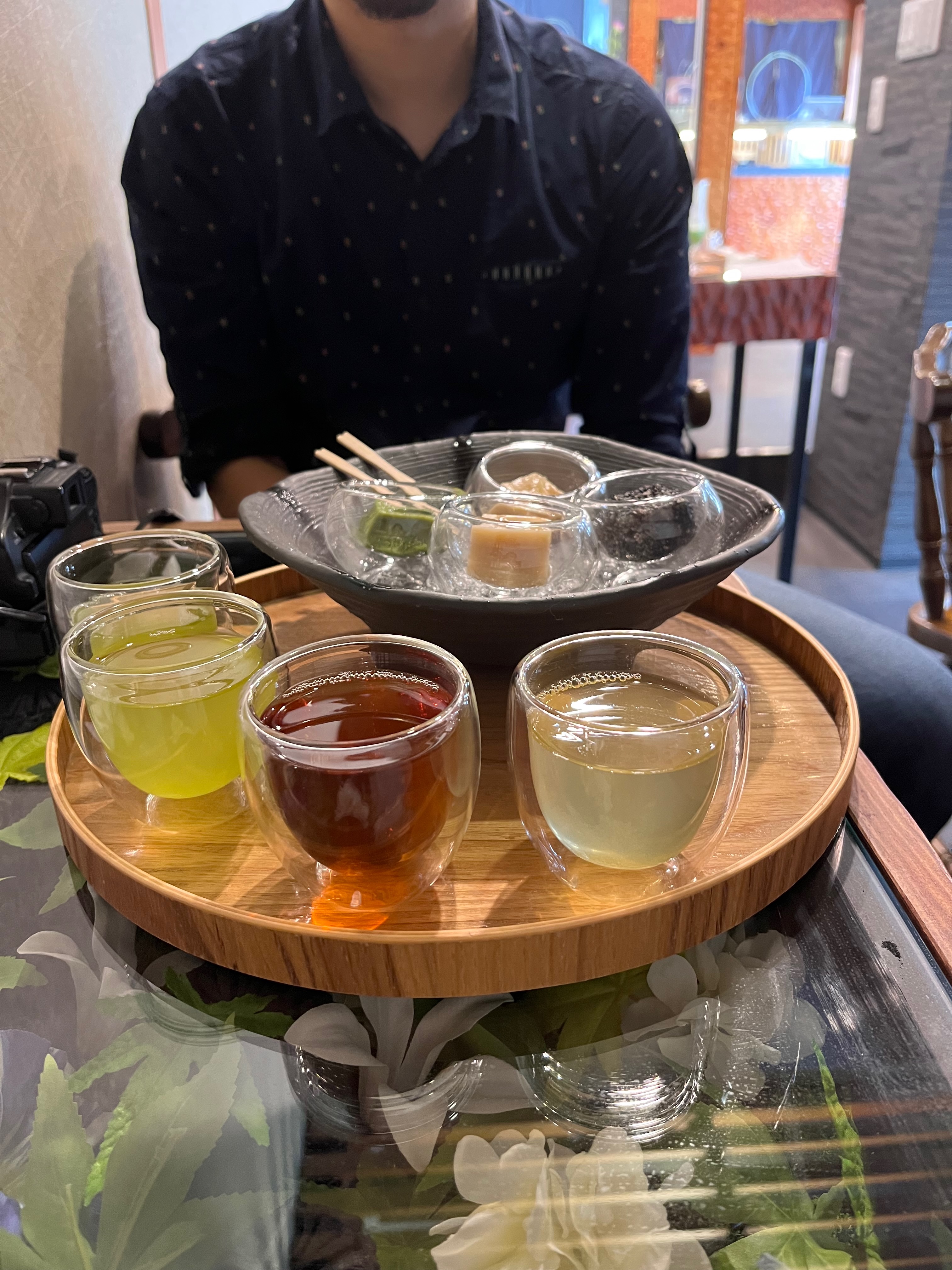 While strolling through the streets, we came to a nice café called “Sweets Cafe Emman Mochi Kyoto Arashiyama,” where we found ourselves trying various matcha teas and enjoying the perfectly matching mochi for each of the four tea flavors. The café offered an inviting and minimalistic atmosphere where tea time was a welcoming and sophisticated break. The Kyoto region is famous for its various tea plantations, from which many delicious matcha teas originate.