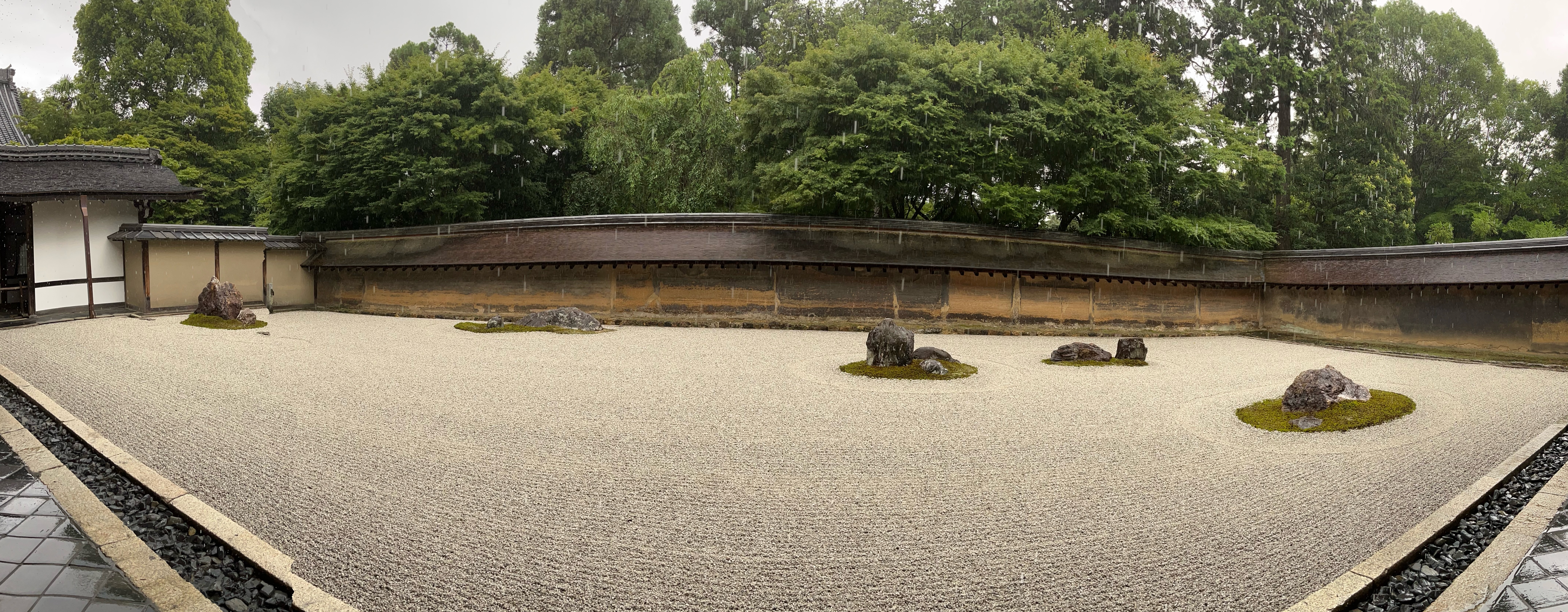 After this wonderful refreshment, we continued our way to the famous Ryoanji Temple. It is a World Cultural Heritage site and very well known for its Zen garden, which was created by the monk Tokuho Zenketzu. What we could see — or not see — were 15 stones of different sizes. The trick is that wherever you stand, you are not able to see all 15 stones at the same time; something always remains hidden. When we were heading for the garden, it began to rain heavily, which was a welcome chance to cool down. Remaining in the temple while observing the raindrops dancing in the Zen garden was a perfect and peaceful moment of calmness and rest.