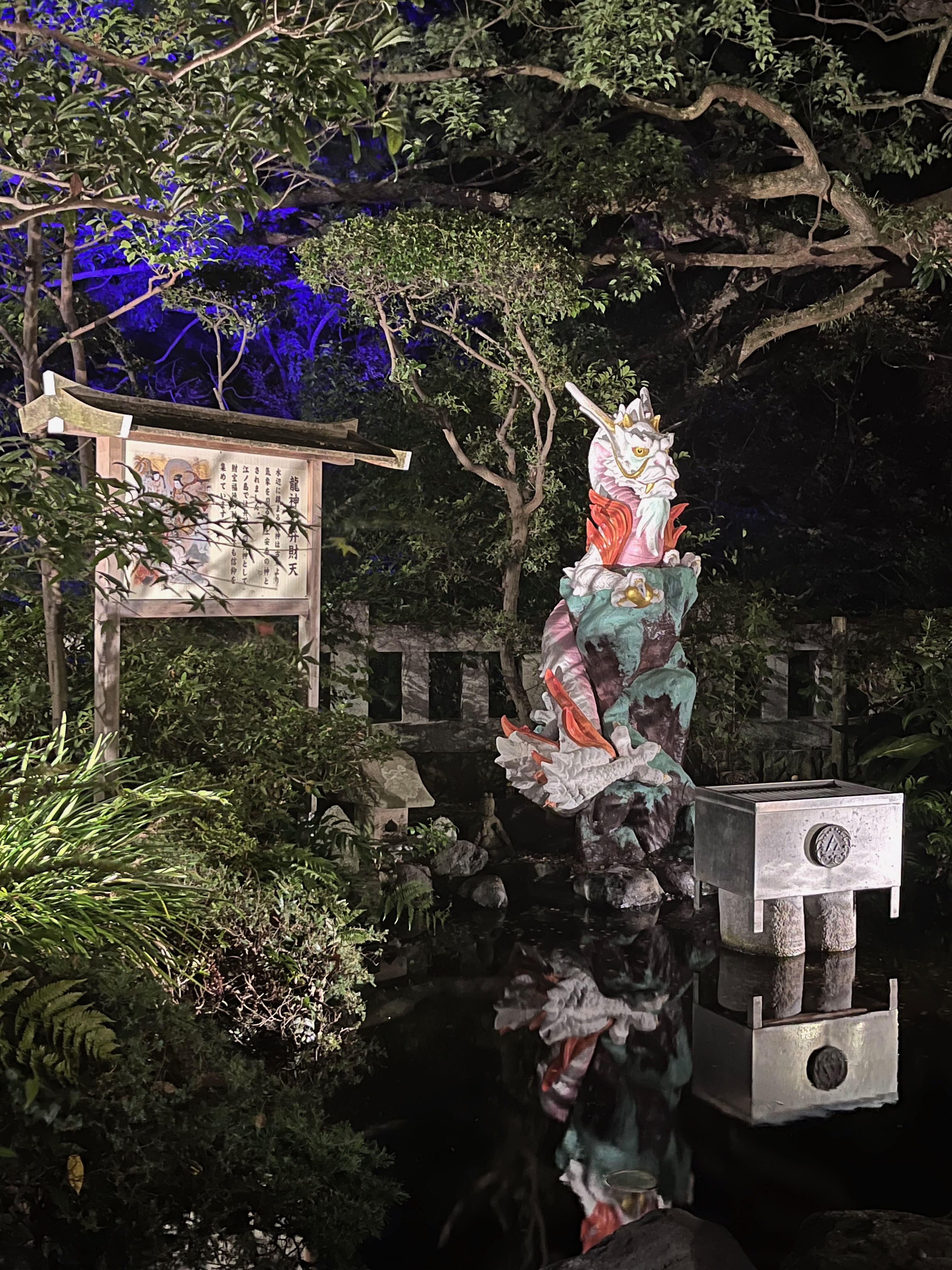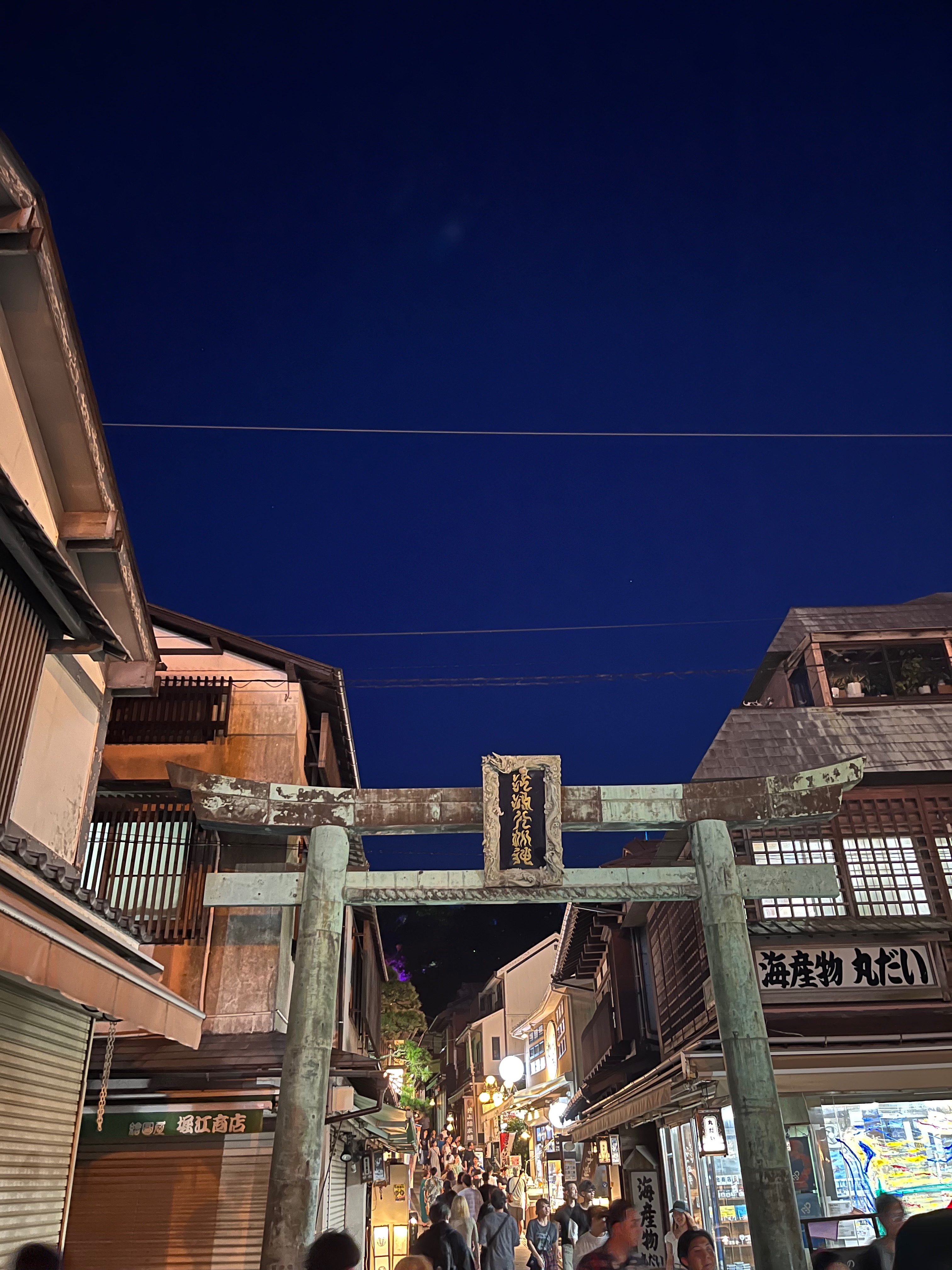 At nightfall, Enoshima — like a Japanese Mont-Saint-Michel — cast a magical spell over us. Most of the shops were already closed, but we were still able to visit the shrine ahead of us and climb the steps to finally reach it. The entrance was beautifully illuminated and very charming. At the top of the shrine, I had to rest. The day had been long and hot, and I was really tired that evening. Unfortunately, I couldn’t rest long enough to see more of this enchanting island because we had to hurry to catch the last tram and the last train back to Tokyo. You definitely don’t want to miss it, as a taxi is very expensive.